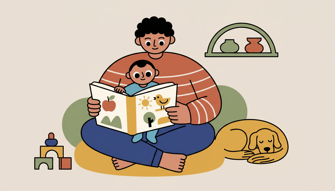 Look at a simple picture book together, sitting close so your child can see both you and the pictures. Point to images and use simple words. Watch your child's face and respond to their interest with enthusiasm. Let them touch the pages and turn them, even if not in order.