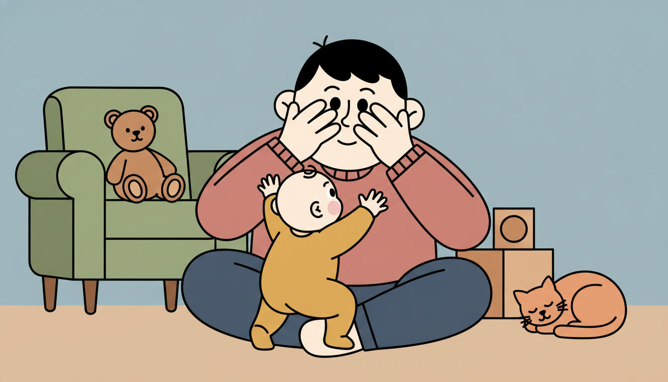 Play peekaboo using the same sequence each time. Say 'I'm hiding' as you cover your face. Wait two seconds, then say 'Here I am' as you reveal yourself. This consistent pattern builds trust in predictable outcomes.