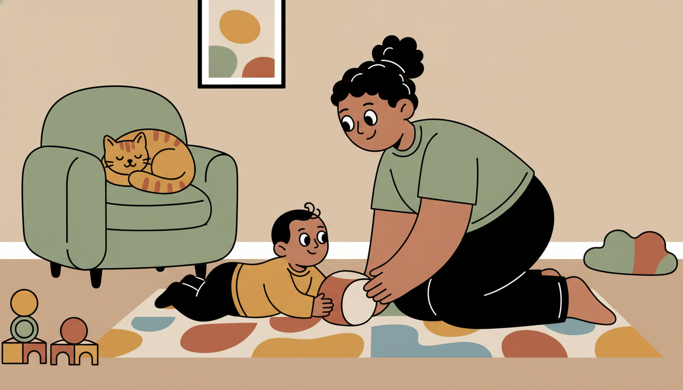 Place your child on a safe surface like a play mat. Sit close by where they can see you easily. Let them explore objects or move their body while you stay nearby. Offer smiles and encouraging sounds when they look at you. Help if they seem frustrated but let them try first.