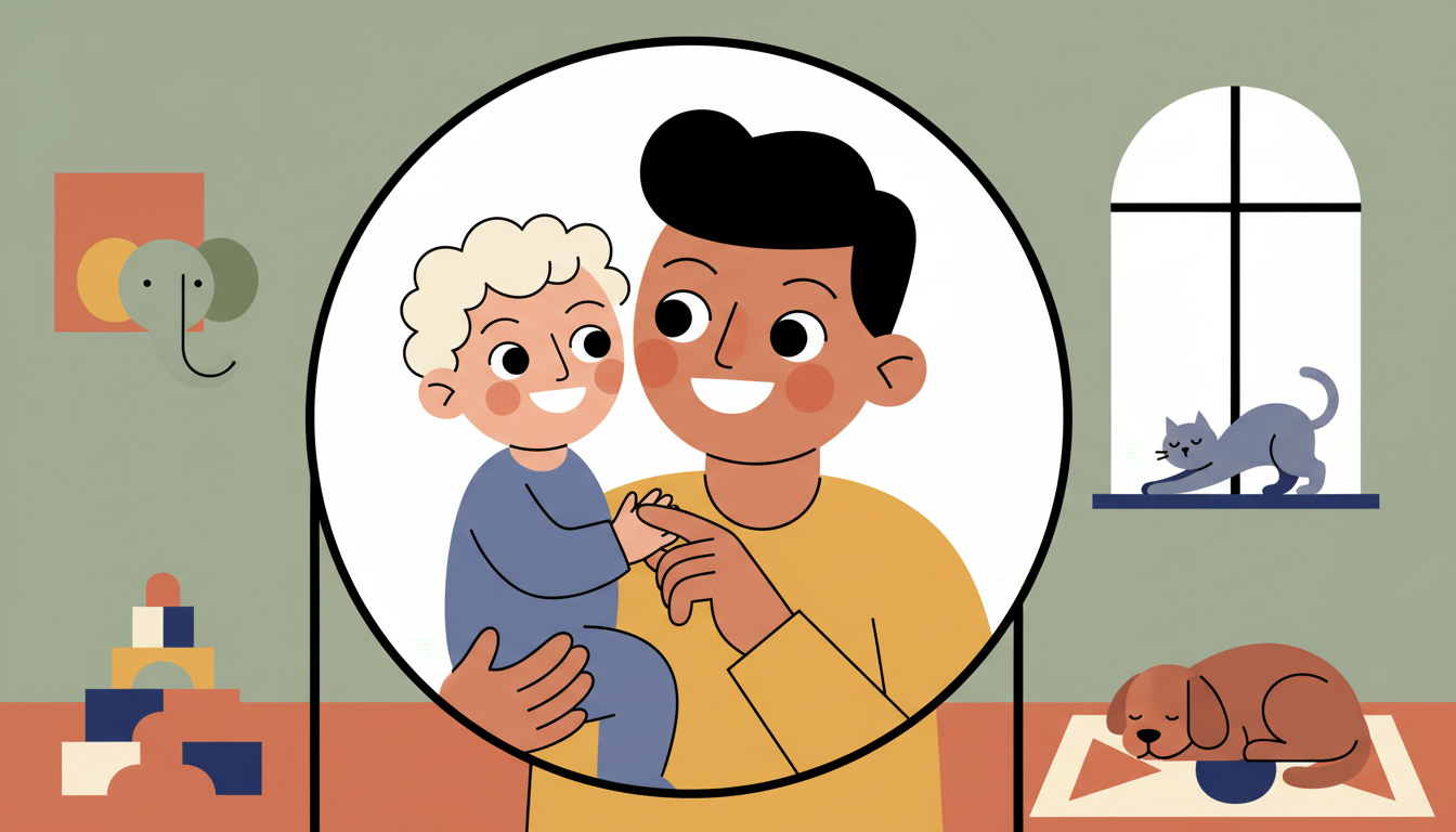 Hold your child in front of a mirror and smile together at your reflections. Use a warm, positive voice to talk about what you see. Point to your smiling faces and maintain an upbeat, joyful tone. This shared positive experience reinforces joyful interactions and self-awareness through your encouraging presence.