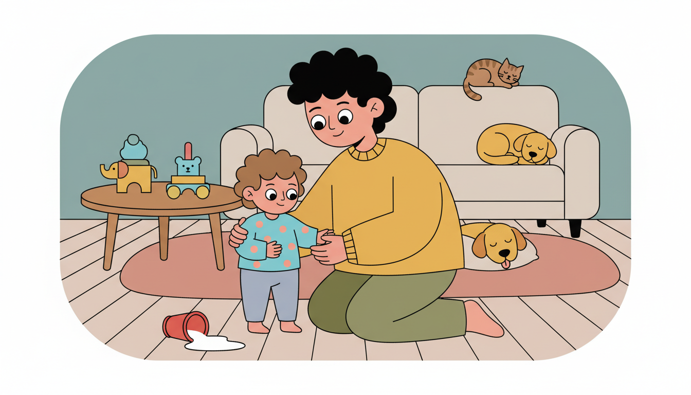 When something spills or breaks, describe what happened truthfully using simple words. Say "The cup fell. Milk spilled. It was an accident." Use a calm voice without blame. This shows your child that telling the truth about mistakes is okay. Clean up together and move on.